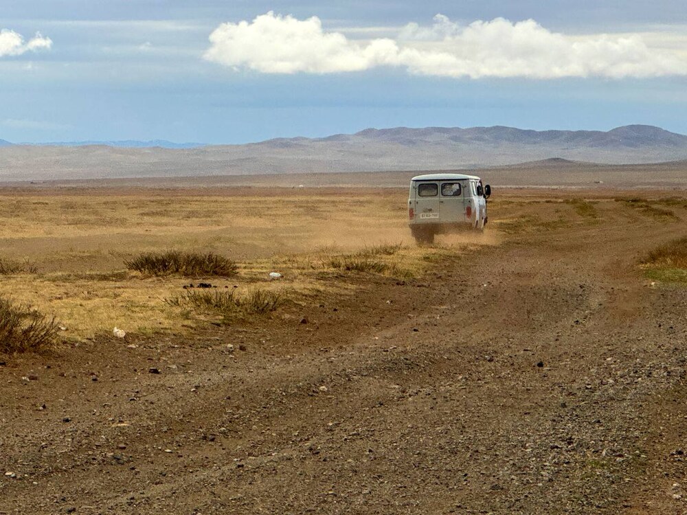 Ветер свистел, и погружал песок, который он нес вместе с собой во все микроскопические трещинки, которые встречаются на его пути. Любые вещи, оставленные в пустыне, заметает песком за несколько часов или уносит далеко и навсегда. На небе висели тонкие и взрыхленные облака, по степи неслись смерчи и ветер завывал в окно машины. Через какое-то время мы выехали из песков и оказались среди песчаников, причудливых конгломератов и базальтов. На горизонте показалась куполообразная вершина похожая на потухший вулкан. Направление, которого мы держались в пустыне, плавно превращалось в хорошо накатанную дорогу. Дальше показалась равнина, с первым поселком и магазинам. Шоппинг всегда прекрасен после нескольких дней странствий без связи, пива и мороженного. За мрачной равниной, мы оказались среди зеленых лугов…Здесь уже стало понятно, что мы покинули царство песков, сольпуг, камня и щебня, сухих русел и каньонов. Перед нами раскинулись зеленые просторы, луга, где мирно пасутся табуны лошадей, а их хозяйки продают прямо на дороге прохладный кумыс. Упрямые сарлыки лежат вдоль дороги, откинув свои коротенькие хвостики, и жуют нескончаемую жвачку.