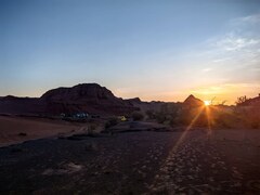 Ну, а мы торопимся успеть до темноты поставить лагерь, или найти приют в любом из кемпингов. Ветер усиливается, на фоне малинового заката, с ледяным ветром где-то со стороны барханов опять появляется смерч. Серый столб пыли и песка несет в сторону дороги. В один момент становиться полностью темно, капает дождь. Грустно, когда заканчивается путешествие в такую неприветливую погоду. Решаем, что последняя ночь будет не в палатках. Заселяемся уже в полной темноте в кемпинг. Нас встречает хозяин этих мест – степной еж, который тоже куда-то торопиться на ночь глядя. Ну а мы торопимся спать. Оказывается, что туристические модели юрт не предназначены для сильного ветра. Вооружившись спальниками, шапками, шерстяными носками, накрываемся еще сверху одеялами с головой. Всю ночь ветер завывал у нас над головами. Одежда, висевшая на стульях легко покачивалась на ветряных струйках. Утром делимся впечатлениями. Мы были не единственными зимующим в эту ночь. Морозный рассвет с ярким солнцем, вкусный завтрак и предвкушения возвращения в мегаполис выправили наши ночные неудобства. Впереди нас простиралась Дорога! Без кочек и ухабов, с плохим, но асфальтом.