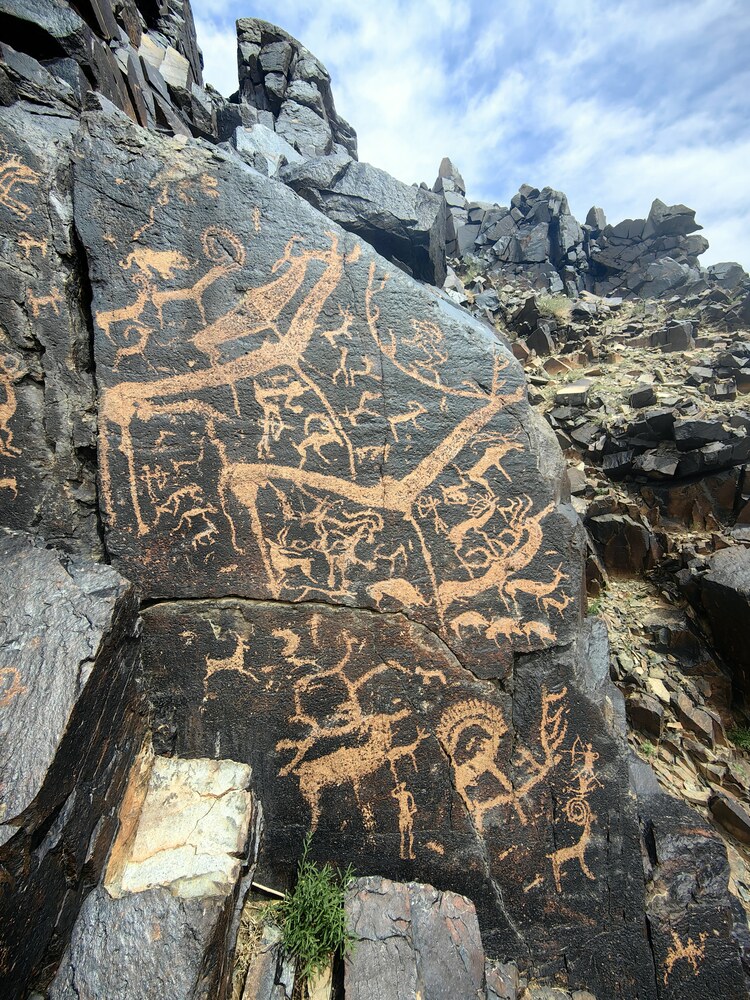 Дальше дорога уходила в горы, и казалось, что мы едем в тупик. Проезд сузился до ширины машины. Мы виляли по черным лабиринтам, грозные и крутые скалы нависали над дорогой, и можно было разглядеть каждую складку, прочитать геологическую историю нашей планеты. Казалось, что мы попали в мертвое царство, в чертоги замка горного короля, который скрывается за одним из поворотов. Мрачную сказку развеяли несколько семей кочевников, которые живут в этом «королевстве», пасут верблюдов и радуются каждому появлению людей. Мы упирались то в один изгиб горной гряды, то в другой и все никак не могли найти заветную цель. Наши опытные проводники все же смогли отличить одну черную скалу от другой такой же и вот мы на месте. Даже в палеолите человек смог найти применение этим гладким и скользящим поверхностям. Первобытный художник уже тогда обладал понятием красоты и хотел передать все свои чаяния, зафиксировать происходящее. Перед нами открылось искусство древнего человека – домашние животные, шаманы, сцены охоты, кочевки и много другое. Еще 50 лет назад было принято считать, что первобытное искусство сосредоточилось в Западной Европе. Никто и не догадывался о существовании вдохновленных мастеров живописи, резьбы и гравюры в Азии и Сибири.